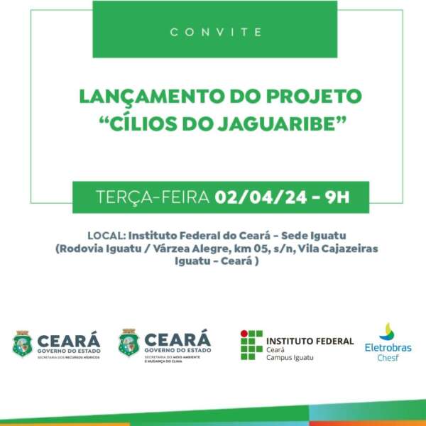 O Governo do Estado do Ceará, através da Secretaria de Recursos Hídricos e da Secretaria de Meio Ambiente, lança nesta terça-feira (02) o Projeto Cílios do Jaguaribe. O evento ocorre no IFCE de Iguatu, no dia às 09h e marca o maior projeto de florestamento, reflorestamento e educação ambiental da Bacia Hidrográfica do Rio Jaguaribe.